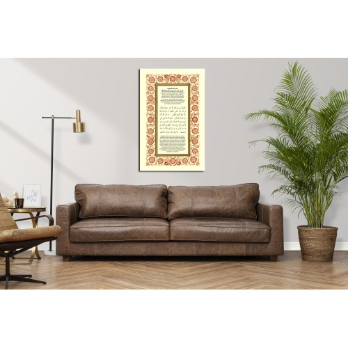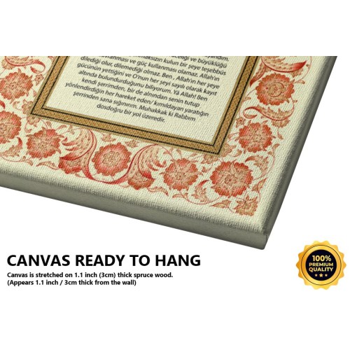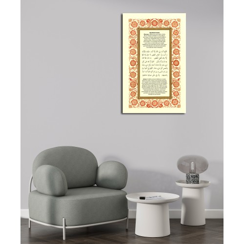 Transliteration: Allāhumme ente rabbi. Lā ilahe illā ent. Aleyke tevekkeltü ve ente rabbu’l arşi’l-aziym. Lā havle velā kuvvete illā billāhi’l aliyyi’l aziym. Maşā’Allāhu kāne wamā lam yashā’ lam yakun. A’lamu anna’llāhe ‘alā kulli shay’in qadīrun ve anna’llāhe qad āḥā kulli shay’in ‘ilmen ve aḥṣā kulli shay’in ‘adada. Allāhumme innī a’ūzu bike min sherri nafsī ve min sherri kulli dābbatin ente ākhizun bināṣiyati-hā. Inne rabbi ‘alā ṣirāṭin mustaqīm.