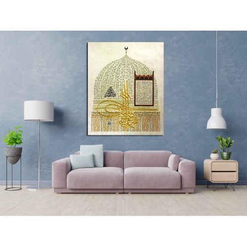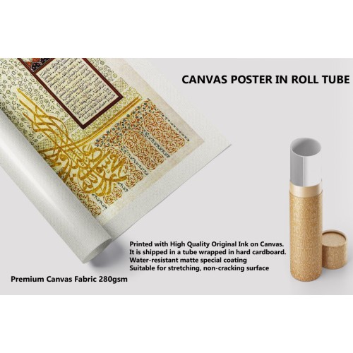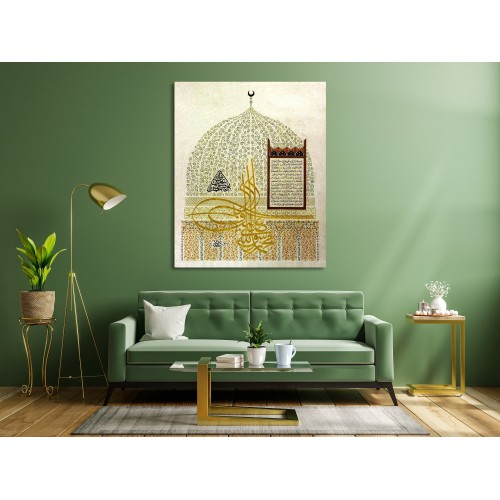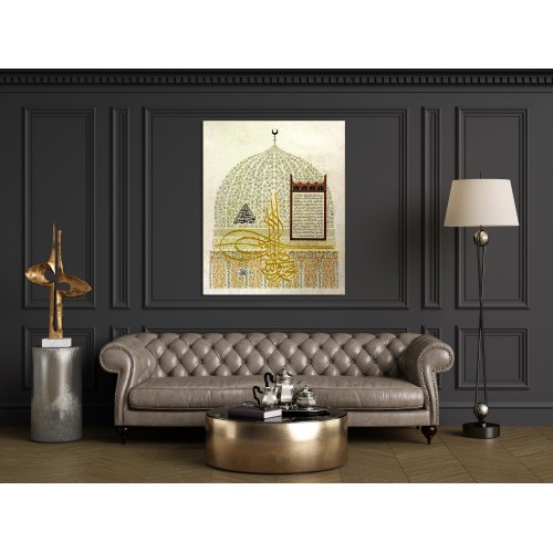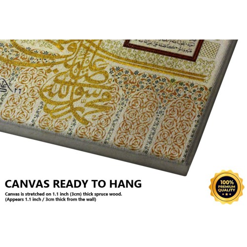 Info: This unique design of hilyah is inspired by the Qubbat Al-Hadra (The Green Dome) the tomb of Muhammad (pbuh) In the middle tughra there writes Muhammad Ar-Rasulallah and the hilyah script is the way the Ali radeyallahu anhu describes Muhammad (pbuh).