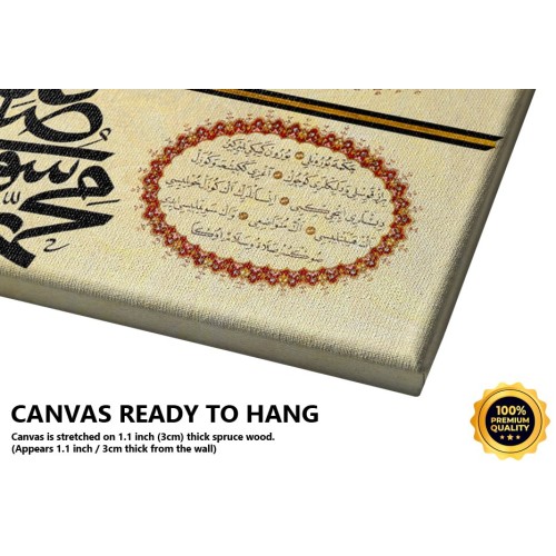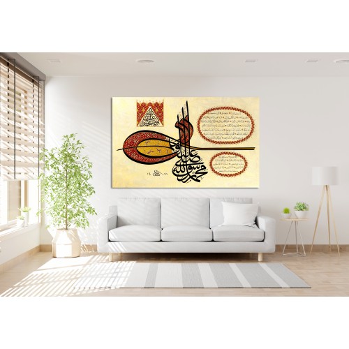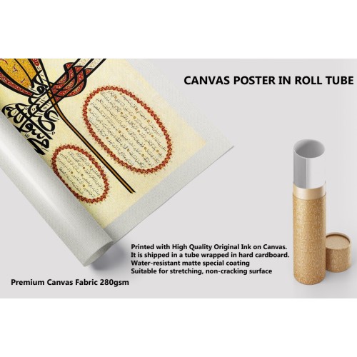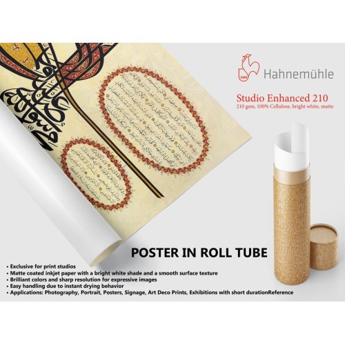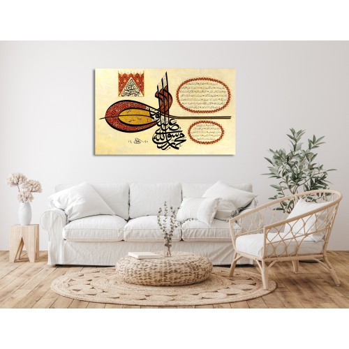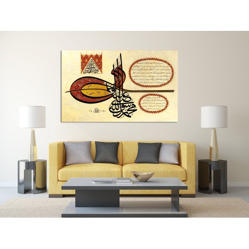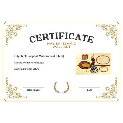 Info: This unique design is a hadith that comes from Ali b Ebi Talib to us which describes the apperance of Muhammad (pbuh). In the middle there writes “Muhammad Ar-Rasulallah” which means “Muhammad is the prophet of Allah.” In the right circles there writes the hadith of Ali and in the left there are names of first four caliph of Islam: