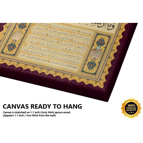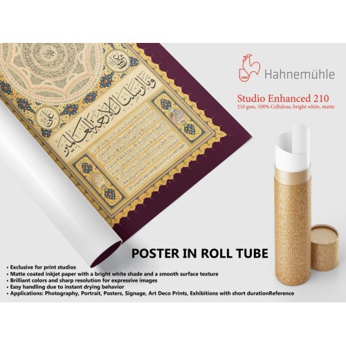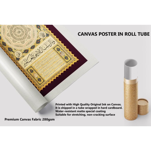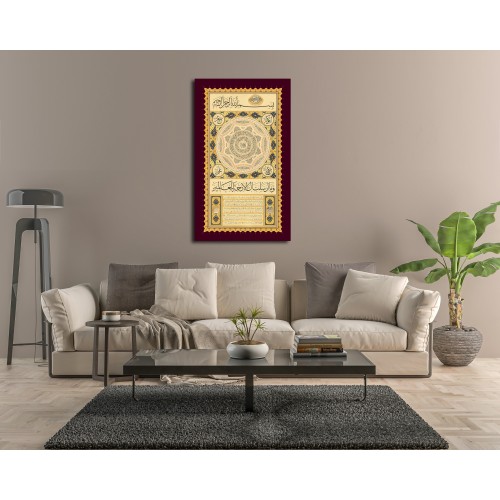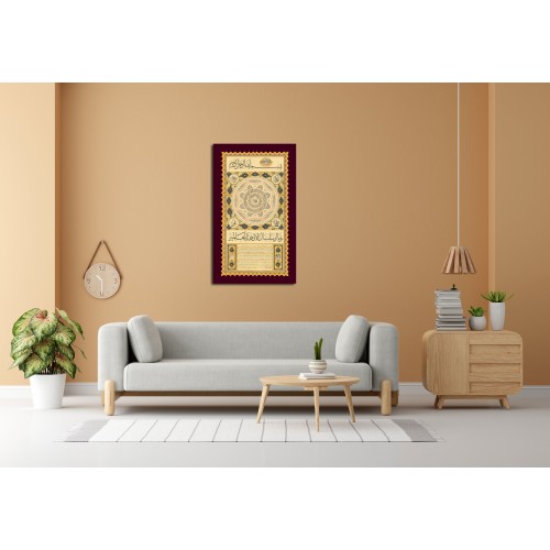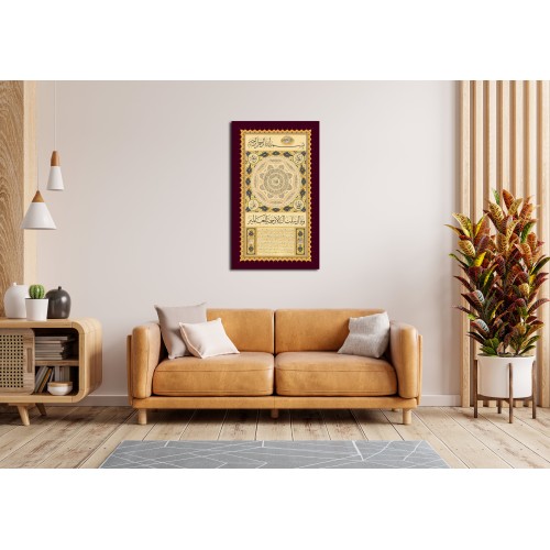 The central section begins with the names of Allah (Ism al-Jalal) and the Prophet (Ism al-Nabi), surrounded by the Ayah from Surah At-Tawbah (9:128), which describes the Prophet's mission as a blessing from Allah. This is followed by the Ayah from Surah Al-Ahzab (33:40) affirming that the Prophet Muhammad is the final messenger. Encircling these are Ayahs from Surah Al-Isra (17:1, 31-32) that mention the Mi’raj, and then the Ayahs from Surah An-Najm (53:1-10) that describe the Mi’raj in detail. The outer ring contains the complete text of Surah Al-Inshirah and Ayahs 81-82 from Surah Al-Imran, with the prayer “Shafa'at Ya Rasool Allah” embellishing the entire composition. The Seal of Prophethood is stamped throughout these circles. Following this, the Hilye-i Şerîfe text, as described by Hazrat Ali, is presented, followed by the Salat al-Tafrijiyya, which highlights some of the Prophet’s magnificent qualities. The names of 96 of the Prophet’s titles are inscribed as red dots, with the outermost circle featuring a Hadith that is said to pertain to the Hilye-i Şerîfe. The names of the four great caliphs are placed in the four corners of the central section, and the Ayah "We have not sent you except as a mercy to the worlds" (Surah Al-Anbiya, 107th Ayah) is inscribed. The closing section includes ten miracles of the Prophet, of which it is said that even fire was extinguished upon contact.
